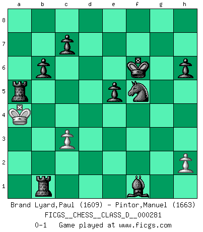 Last move : 0-1 2021 December 26 19:10:47 [Event "FICGS__CHESS__CLASS_D__000281"] [Site "FICGS"] [Date "2021.12.16"] [Round "1"] [White "Brand Lyard,Paul"] [Black "Pintor,Manuel"] [Result "0-1"] [WhiteElo "1609"] [BlackElo "1663"] 1.e4 e5 2.Bc4 Nc6 3.Qh5 Qf6 4.g4 Bc5 5.f3 Nd4 6.Bxf7+ Qxf7 7.Qxf7+ Kxf7 8.Kd1 d6 9.c3 Nc6 10.b4 Bb6 11.Nh3 Nf6 12.d3 h6 13.Na3 Nxg4 14.fxg4 Bxg4+ 15.Kc2 Bxh3 16.Nc4 Bf2 17.b5 Ne7 18.Be3 Bh4 19.Kb3 b6 20.d4 exd4 21.Bxd4 Be6 22.Raf1+ Bf6 23.Rxf6+ gxf6 24.Bxf6 Kxf6 25.e5+ dxe5 26.Rf1+ Nf5 27.Kb2 Bxc4 28.Kc2 Bxf1 29.a4 a6 30.bxa6 Rxa6 31.Kb3 Rd8 32.Kb4 Rd1 33.a5 Rb1+ 34.Ka4 Rxa5+ 0-1 Bishop's Opening Player Black won this chess game. Follow this game move after move (download)Chess is played with the mind and not with the hands ! (Renaud and Kahn) Ich kämpfe solange mein Gegner einen Fehler machen kann. (Emanuel Lasker) Debió haber existido una vez en que los hombres eran semidióses, de otra manera no hubiesen podido inventar el Ajedrez. (Gustav Schenk) C'est une question de caractère, Beaucoup de gens perdent leur motivation très vite. D'autres, ils sont rares, peuvent la conserver très longtemps. J'aime les échecs, encore aujourd'hui je suis heureux d'analyser des parties. J'aime toujours gagner, je déteste encore perdre. Bien jouer est important pour mon intégrité intellectuelle et morale. Et puis les échecs vivent en ce moment une période historique grâce à Internet. Ils se développent dans les systèmes éducatifs à travers le monde. Ils sortent de leur ghetto, et c'est mon rôle de mener à bien cette révolution. (Gary Kasparov) It's not enough to succeed. Others must fail. (Gore Vidal)