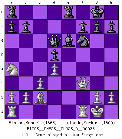 Last move : 1-0 2022 March 11 19:24:5 [Event "FICGS__CHESS__CLASS_D__000281"] [Site "FICGS"] [Date "2021.12.16"] [Round "1"] [White "Pintor,Manuel"] [Black "Lalande,Markus"] [Result "1-0"] [WhiteElo "1663"] [BlackElo "1600"] 1.e4 c6 2.f4 e5 3.Nf3 exf4 4.Bc4 d5 5.exd5 cxd5 6.Bb3 Nf6 7.d4 Bd6 8.O-O O-O 9.Nc3 Be6 10.Ne5 Qb6 11.Bxf4 Nbd7 12.Na4 Qc7 13.Nxd7 Nxd7 14.Bxd6 Qxd6 15.c3 Rfe8 16.Bc2 Nf6 17.Qf3 1-0 This chess game has been lost on time (started : 2021.12.16 7:34:53) Caro-Kann defense Kingside Castling by player White (move 8) Kingside Castling by player Black (move 8) Player White won this chess game. Follow this game move after move (download)It is not a move, even the best move that you must seek, but a realizable plan. (Eugene Znosko-Borovsky) Ich bin stolz ein Bulgare zu sein. (Veselin Topalov) Uno no tiene que jugar muy bien, es suficiente jugar mejor que el oponente. (Siegbert Tarrasch) Roi des jeux et jeu des rois, les échecs portent en eux un sentiment d'infini. Ils donnent à celui qui s'est efforcé d'en approfondir les arcanes l'impression de n'être pas à la mesure de l'homme; en fait, ils constituent un résumé de l'univers, un microcosme, et figurent cette grande échelle qui, dans les plans de la lumière descend jusqu'à la matière, qui des abîmes insondables remonte jusqu'en l'infini de Dieu. (Pyrame) A good programmer is someone who always looks both ways before crossing a one-way street. (Doug Linder)