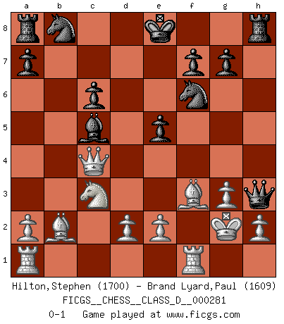 Last move : 0-1 2021 December 26 19:20:48 [Event "FICGS__CHESS__CLASS_D__000281"] [Site "FICGS"] [Date "2021.12.16"] [Round "1"] [White "Hilton,Stephen"] [Black "Brand Lyard,Paul"] [Result "0-1"] [WhiteElo "1700"] [BlackElo "1609"] 1.Nf3 d5 2.c4 dxc4 3.g3 Bg4 4.Bg2 Bxf3 5.Bxf3 c6 6.O-O b5 7.Nc3 b4 8.Nb1 h5 9.b3 cxb3 10.Qxb3 Nf6 11.Qxb4 h4 12.Bb2 Qc7 13.Nc3 hxg3 14.fxg3 e5 15.Qb3 Bc5+ 16.Kg2 Qd7 17.Qc4 Qh3+ 0-1 Comment by player 2 : Paul Brand Lyard : Oh my god!!!Checkmate in 1. K.h1 forced hehe hehe... Q.h2#! for futuring studies...... gg! game "One king trapped". Paul Brand Lyard This game could be finish, resign is right. Paul Brand Lyard A S.L Reti accepted Kingside Castling by player White (move 6) Player Black won this chess game. Follow this game move after move (download)Mistrust is the most necessary characteristic of the Chess player. (Siegbert Tarrasch) Schach ist gnadenlos. Du mußt bereit sein zu töten. (Nigel Short) Cada Peón es una Reina en potencia. (James Mason) Vous n'êtes pas toujours obligé de jouer le meilleur coup. Un coup doit être actif, entreprenant, correct et beau ! (David Bronstein) Nothing is more important for teaching us to understand the concepts we have than constructing fictitious ones. (Ludwig Wittgenstein)