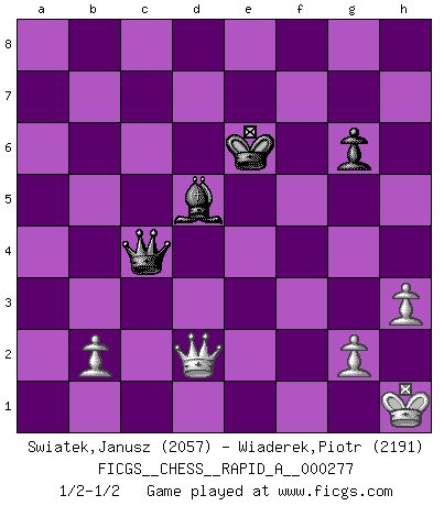 Last move : 1/2-1/2 2022 February 28 13:29:8 [Event "FICGS__CHESS__RAPID_A__000277"] [Site "FICGS"] [Date "2021.12.19"] [Round "1"] [White "Swiatek,Janusz"] [Black "Wiaderek,Piotr"] [Result "1/2-1/2"] [WhiteElo "2057"] [BlackElo "2191"] 1.Nf3 d5 2.d4 Nf6 3.c4 c6 4.Nc3 e6 5.Bg5 h6 6.Bxf6 Qxf6 7.e3 Nd7 8.Bd3 dxc4 9.Bxc4 g6 10.O-O Bg7 11.a4 O-O 12.a5 Rb8 13.h3 Rd8 14.Qb3 c5 15.d5 Ne5 16.Nxe5 Qxe5 17.Rfd1 b5 18.Nxb5 a6 19.dxe6 Rf8 20.exf7+ Kh8 21.Qa4 axb5 22.Bxb5 Rb7 23.a6 Rbxf7 24.a7 Bb7 25.Rd2 Ba8 26.Qc2 Qg5 27.Bf1 h5 28.Qd3 c4 29.Qc2 Be5 30.Re2 Bd6 31.Ra6 Bg3 32.fxg3 Rxf1+ 33.Kh2 h4 34.Qc3+ Kh7 35.gxh4 Qxh4 36.Rd6 R8f7 37.Rd4 Qe7 38.Qxc4 Qe5+ 39.Rf4 Rc7 40.Qa4 Re7 41.Rc2 Re1 42.Qb4 Qxe3 43.Rcf2 Qxa7 44.Rf7+ Rxf7 45.Rxf7+ Qxf7 46.Qxe1 Qf4+ 47.Kg1 Qe4 48.Qf2 Bd5 49.Kh2 Kh6 50.Qd2+ Kg7 51.Qf2 Bc6 52.Kh1 Qc4 53.Qg3 Qe4 54.Qf2 Bb7 55.Kg1 Bd5 56.Kh1 Qe5 57.Kg1 Qg5 58.Kh1 Qf6 59.Qd2 Qf5 60.Qd4+ Kf7 61.Kh2 Qe4 62.Qd2 Kf6 63.Kg1 Ke6 64.Qf2 Qb1+ 65.Kh2 Qe4 66.Qd2 Qe5+ 67.Kg1 Qe4 68.Kh1 Qc4 1/2-1/2 Reti Opening Kingside Castling by player White (move 10) Kingside Castling by player Black (move 11) 10 pieces endgame at move 45 : White KQPPP , Black KQRBP WHITE : King + 1 Queen 3 Pawns BLACK : King + 1 Queen 1 Rook 1 Bishop 1 Pawn 9 pieces endgame at move 46 : White KQPPP , Black KQBP WHITE : King + 1 Queen 3 Pawns BLACK : King + 1 Queen 1 Bishop 1 Pawn This chess game ended in a draw. Follow this game move after move (download)No Chess Grandmaster is normal; they only differ in the extent of their madness. (Viktor Korchnoi) Sie bekommen vielleicht den Eindruck, dass die Spitzenspieler überhaupt gar nicht so stark sind. Aber das stimmt nicht. Es ist eine Illusion. Mit einem Computer an der Seite ist es sehr leicht, Urteile zu fällen, aber wenn man alleine am Brett sitzt, sieht die Sache ganz anders aus. (Vladimir Kramnik) El Ajedrez es el gimnasio de la mente. (Blaise Pascal) Les échecs sont plus proches de l'art de l'assassinat que de l'art de la guerre. (Arturo Perez-Reverte) Dave, my mind is going. I can feel it. (HAL 9000 in 2001, a space odyssey)