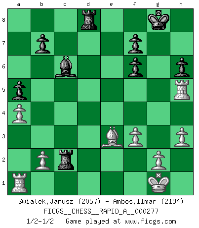 Last move : 1/2-1/2 2022 February 12 10:32:40 [Event "FICGS__CHESS__RAPID_A__000277"] [Site "FICGS"] [Date "2021.12.19"] [Round "1"] [White "Swiatek,Janusz"] [Black "Ambos,Ilmar"] [Result "1/2-1/2"] [WhiteElo "2057"] [BlackElo "2194"] 1.Nf3 d5 2.d4 Nf6 3.c4 e6 4.Nc3 Bb4 5.cxd5 exd5 6.Bf4 c6 7.e3 Bf5 8.Qb3 Qb6 9.h3 a5 10.a3 Bxc3+ 11.Qxc3 Ne4 12.Qc1 Nd7 13.Be2 O-O 14.O-O h6 15.Ne5 Nxe5 16.Bxe5 Rfe8 17.f3 Nf6 18.a4 Nd7 19.Bg3 c5 20.Bb5 cxd4 21.exd4 Qxd4+ 22.Bf2 Qf6 23.Qf4 Rec8 24.Bxd7 Bxd7 25.Qxf6 gxf6 26.Rfd1 Rc2 27.Rxd5 Bc6 28.Rh5 Rd8 29.Be3 1/2-1/2 Reti Opening Kingside Castling by player Black (move 13) Kingside Castling by player White (move 14) This chess game ended in a draw. Follow this game move after move (download)One of these modest little moves may be more embarrassing to your opponent than the biggest threat. (Siegbert Tarrasch) Modernes Schach erfordert enorme Anspannung. Es ist für einen normalen Menschen unmöglich das auszuhalten. (Viktor Kortschnoi) El Ajedrez es la vida. (Bobby Fischer) Je crois qu'il existe des manières très spécifiques de jouer efficacement contre une machine. Evidemment, nous n'avons aucune chance en technique pure, parce que l'ordinateur calcule de manière parfaite. Mais lorsque nous faisons appel à notre cerveau, en utilisant l'intuition et la compréhension, alors nous restons beaucoup plus forts. (Anatoli Karpov) The best teachers teach from the heart, not from the book. (Author unknown)