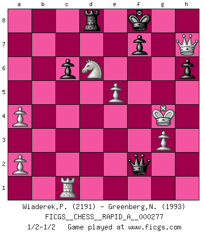 Last move : 1/2-1/2 2022 January 29 8:35:17 [Event "FICGS__CHESS__RAPID_A__000277"] [Site "FICGS"] [Date "2021.12.19"] [Round "1"] [White "Wiaderek,Piotr"] [Black "Greenberg,Normund"] [Result "1/2-1/2"] [WhiteElo "2191"] [BlackElo "1993"] 1.d4 d5 2.c4 e6 3.Nc3 a6 4.cxd5 exd5 5.Nf3 Nf6 6.Bg5 Be6 7.e3 Nbd7 8.Bd3 h6 9.Bf4 g5 10.Bg3 Nh5 11.Be5 Ng7 12.h3 Nxe5 13.Nxe5 Bd6 14.Qb3 O-O 15.Qxb7 Rb8 16.Qc6 Bxe5 17.dxe5 d4 18.Ne4 dxe3 19.Qc3 exf2+ 20.Kxf2 c6 21.b3 Nh5 22.Rac1 a5 23.Rhe1 Nf4 24.Bc2 Rb4 25.Bb1 Qb6+ 26.Kg3 Rd8 27.Kh2 a4 28.bxa4 Rc4 29.Qa3 Rxc1 30.Rxc1 Qb8 31.Nd6 Qb6 32.Qc3 Qf2 33.Qc2 Nxh3 34.Qh7+ Kf8 35.Bf5 Qf4+ 36.g3 Qf2+ 37.Kxh3 g4+ 38.Bxg4 Bxg4+ 39.Kxg4 Qe2+ 40.Kf4 Qf2+ 41.Kg4 1/2-1/2 QGD : Janowski variation Kingside Castling by player Black (move 14) This chess game ended in a draw. Follow this game move after move (download)By playing at Chess then, we may learn: First: Foresight... Second: Circumspection... Third: Caution... And lastly, we learn by Chess the habit of not being discouraged by present bad appearances in the state of our affairs, the habit of hoping for a favorable chance, and that of persevering in the secrets of resources. (Benjamin Franklin) Charakterschwächen offenbaren sich normalerweise während einer Schachpartie. (Garry Kasparov) Las combinaciones han sido siempre el aspecto más intrigante del Ajedrez. Los Maestros las buscan, el público las aplauden, los críticos las alaban. La razón se debe a que las combinaciones hacen posible que el Ajedrez sea más que un ejercicio matemático con una carencia de vida. Ellas son la poesía del juego, son del Ajedrez lo que la melodía es de la música. Ellas representan el triunfo de la mente sobre la materia. (Reuben Fine) Mon pion favori sur ma case favorite ! Bronstein en parlant d'un coup de pion en h5 quand il avait les Noirs. You must do what you feel is right... of course. (Obi-Wan Kenobi in Star Wars ep.4)
