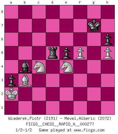 Last move : 1/2-1/2 2022 March 12 6:16:33 [Event "FICGS__CHESS__RAPID_A__000277"] [Site "FICGS"] [Date "2021.12.19"] [Round "1"] [White "Wiaderek,Piotr"] [Black "Mevel,Alberic"] [Result "1/2-1/2"] [WhiteElo "2191"] [BlackElo "2072"] 1.d4 Nf6 2.c4 g6 3.Nc3 Bg7 4.e4 d6 5.h3 O-O 6.Be3 e5 7.d5 a5 8.g4 Na6 9.Nge2 Nd7 10.Qd2 Ndc5 11.Ng3 c6 12.O-O-O a4 13.f3 Qa5 14.h4 h6 15.Nb1 Qxd2+ 16.Bxd2 cxd5 17.cxd5 Bd7 18.Na3 b5 19.h5 b4 20.Nc4 a3 21.b3 Nxb3+ 22.axb3 Nc5 23.Kc2 Nxb3 24.Kxb3 Ba4+ 25.Ka2 Bxd1 26.Bxb4 Rfb8 27.Bd3 Bxf3 28.Bxd6 Bxh1 29.Bxb8 Rxb8 30.Nxh1 Bf8 31.Nf2 Kg7 32.Bc2 Rc8 33.Bb3 f6 34.Nd1 f5 35.exf5 gxf5 36.gxf5 Rd8 37.Nc3 Bb4 38.Ne4 Rxd5 1/2-1/2 King's Indian : Makagonov system (5.h3) Kingside Castling by player Black (move 5) Queenside Castling by player White (move 12) This chess game ended in a draw. Follow this game move after move (download)Chess is no whit inferior to the violin, and we have a large number of professional violinists. (Mikhail Botvinnik) Im Reiche der Wirklichkeit ist man nie so glücklich wie im Reiche der Gedanken. (Arthur Schopenhauer) Siempre es mucho mejor sacrificar las piezas de tu oponente. (Savielly Tartakover) Votre seul travail dans les ouvertures est d'obtenir un milieu de partie jouable. (Lajos Portish) Creativity is inventing, experimenting, growing, taking risks, breaking rules, making mistakes, and having fun. (Mary Lou Cook)