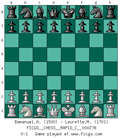 Last move : 0-1 2022 January 27 4:30:35 [Event "FICGS__CHESS__RAPID_C__000278"] [Site "FICGS"] [Date "2021.12.27"] [Round "1"] [White "Emmanuel,Asikoko"] [Black "Leurette,Marc-Antoine"] [Result "0-1"] [WhiteElo "1500"] [BlackElo "1701"] 0-1 This chess game has been lost on time (started : 2021.12.27 17:41:55) Player Black won this chess game. Follow this game move after move (download)That's what Chess is all about. One day you give your opponent a lesson, the next day he gives you one. (Bobby Fischer) Alle Schachspieler sollten auch ein Hobby haben. (Savielly Grigorievitsch Tartakower) Cuando me preguntan: -¿Cual es el secreto que te hace hacer mejores movidas que tus oponentes?, Yo respondo: Me da gusto que me pregunten eso, porque, como veran, hay una simple razón. Yo pienso mis propias movidas y dejo a mi oponente que el piense las suyas. (Alexander Alekhine) Les ravages du H expliquent la différence de niveau entre Tal et Thal [Abergel]. I find your interest interesting. (Gregory House, House M.D.)