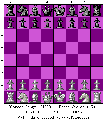 Last move : 0-1 2022 January 27 4:30:35 [Event "FICGS__CHESS__RAPID_C__000278"] [Site "FICGS"] [Date "2021.12.27"] [Round "1"] [White "Alarcon,Rongel"] [Black "Perez,Victor"] [Result "0-1"] [WhiteElo "1500"] [BlackElo "1500"] 0-1 This chess game has been lost on time (started : 2021.12.27 17:41:55) Player Black won this chess game. Follow this game move after move (download)Only the player with the initiative has the right to attack. (Wilhelm Steinitz) Das Schachspiel übertrifft alle anderen Spiele so weit wie der Chimborasso einen Misthaufen. (Arthur Schopenhauer) En el Ajedrez, tal como es jugado por los Maestros, practicamente la suerte es eliminada. (Emanuel Lasker) Celui qui prend des risques peut perdre, celui qui n'en prend pas perd toujours. (Xavier Tartacover) It's not the will to win, but the will to prepare to win that makes the difference. (Bear Bryant)