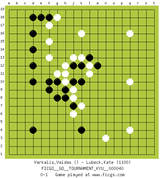 Last move : 0-1 2007 September 17 8:47:2 [Event "FICGS__GO__TOURNAMENT_KYU__000040"] [Site "FICGS"] [Date "2007.07.25"] [Round "1"] [Black "Varkalis,Valdas"] [White "Lubeck,Kate"] [Result "0-1"] [Rating 2 "1100"] 1.d16 q4 2.d4 q16 3.d10 q10 4.k10 k16 5.k4 f17 6.d18 n3 7.f18 g18 8.e18 f15 9.d14 f13 10.d12 g11 11.g10 h10 12.h9 g9 13.f10 j9 14.h8 j8 15.g8 h12 16.f9 j6 17.j10 h11 18.j12 j13 19.k12 k13 20.l13 l12 21.m12 l11 22.j7 k7 0-1 This go game has been lost on time (started : 2007.07.25 20:23:31) Here are the names of the openings (joseki) played in the four corners : Corner d16 : d16 f17 Hoshi (Hwajeom, Seongjeom, Xingwei`) 4-4 Point. The star or hoshi (4-4) point, emphasizing influence at the potential expense of territory. Ikken Kakari (Hankan Keolch'im, Yi Gua`jiao~, 1-Space Low Approach). White 2 is the standard approach move to the 4-4. Corner q16 : q16 l13 Hoshi (Hwajeom, Seongjeom, Xingwei`) 4-4 Point. The star or hoshi (4-4) point, emphasizing influence at the potential expense of territory. Player White won this Go (weiqi, baduk) game. Follow this game move after move (download)When in doubt, remove the enemy stones from the board. (Bill Taylor) There are more things in heaven and earth than practically anywhere else. (Unknown)