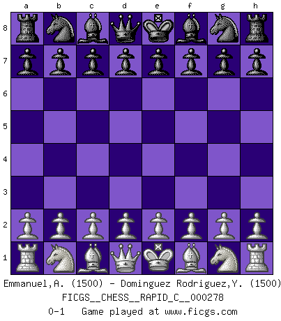 Last move : 0-1 2022 January 27 4:30:35 [Event "FICGS__CHESS__RAPID_C__000278"] [Site "FICGS"] [Date "2021.12.27"] [Round "1"] [White "Emmanuel,Asikoko"] [Black "Dominguez Rodriguez,Yosvany"] [Result "0-1"] [WhiteElo "1500"] [BlackElo "1500"] 0-1 This chess game has been lost on time (started : 2021.12.27 17:41:55) Player Black won this chess game. Follow this game move after move (download)Let the perfectionist play postal. (Yasser Seirawan) Capablanka war das größte Genie der Schachgeschichte! Aber denken sie nicht er habe nichts vom Schach verstanden. Er wusste nur soviel wie er wissen musste um seine Ziele zu erreichen. (Mikhail Moiseyevich Botvinik) Desconfianza es la característica mas necesaria de un jugador de Ajedrez. (Siegbert Tarrasch) J'ai vu le vaincu d'Echecs jouer des années durant dans l'espoir de la fête de la victoire. Car tu es plus riche de ce qu'elle existe si même elle n'est point pour toi. Ainsi de la perle du fond des mers. (Antoine de Saint-Exupéry) Creativity is inventing, experimenting, growing, taking risks, breaking rules, making mistakes, and having fun. (Mary Lou Cook)