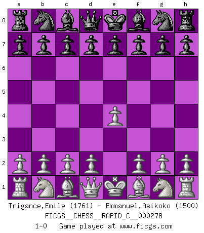 Last move : 1-0 2022 February 3 7:0:5 [Event "FICGS__CHESS__RAPID_C__000278"] [Site "FICGS"] [Date "2021.12.27"] [Round "1"] [White "Trigance,Emile"] [Black "Emmanuel,Asikoko"] [Result "1-0"] [WhiteElo "1761"] [BlackElo "1500"] 1.e4 1-0 This chess game has been lost on time (started : 2021.12.27 17:41:55) King's pawn Opening Player White won this chess game. Follow this game move after move (download)The passed Pawn is a criminal, who should be kept under lock and key. Mild measures, such as police surveillance, are not sufficient. (Aaron Nimzovich) Der vorletzte Fehler gewinnt. (Savielly Grigorievitsch Tartakower) Debemos de asegurarnos de que el Ajedrez no se convierta en un lenguaje muerto, muy interesante, pero solo para un grupo muy pequeño. (Sytze Faber) Le joueur d'Echecs qui veut atteindre le top est obligé de développer son propre credo créatif. Alexeï Stepanovicth Souétine. Il est facile d'écrire des livres ! Ce qui est difficile, c'est de jouer ! (Alexeï Stepanovicth Souétine) Just because you do not take an interest in politics doesn't mean politics won't take an interest in you. (Pericles 430 B.C.)