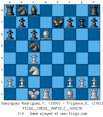 Last move : 1-0 2022 January 12 15:45:46 [Event "FICGS__CHESS__RAPID_C__000278"] [Site "FICGS"] [Date "2021.12.27"] [Round "1"] [White "Dominguez Rodriguez,Yosvany"] [Black "Trigance,Emile"] [Result "1-0"] [WhiteElo "1500"] [BlackElo "1761"] 1.e4 d5 2.exd5 Nf6 3.d4 Nxd5 4.c4 Nb6 5.Nc3 e5 6.Nf3 exd4 7.Qxd4 Qxd4 8.Nxd4 a6 9.Bf4 c6 10.O-O-O Be7 11.Bc7 N6d7 12.Nf5 Nc5 13.Nxe7 Kxe7 14.Bd6+ 1-0 Scandinavian : Marshall variation Queenside Castling by player White (move 10) Player White won this chess game. Follow this game move after move (download)A strong memory, concentration, imagination, and a strong will is required to become a great Chess player. (Bobby Fischer) Sie bekommen vielleicht den Eindruck, dass die Spitzenspieler überhaupt gar nicht so stark sind. Aber das stimmt nicht. Es ist eine Illusion. Mit einem Computer an der Seite ist es sehr leicht, Urteile zu fällen, aber wenn man alleine am Brett sitzt, sieht die Sache ganz anders aus. (Vladimir Kramnik) Jugadores de primera clase pierden en contra de jugadores de segunda clase porque los jugadores de segunda clase a veces juegan una partida de primer clase. (Siegbert Tarrasch) Les Echecs mettent en conflit, non pas deux intelligences, mais deux volontés. (Lasker) The existence of forgetting has never been proved: We only know that some things don't come to mind when we want them. (Friedrich Nietzsche)