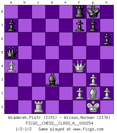 Last move : 1/2-1/2 2022 January 30 8:56:29 [Event "FICGS__CHESS__CLASS_A__000254"] [Site "FICGS"] [Date "2021.12.30"] [Round "1"] [White "Wiaderek,Piotr"] [Black "Wilson,Norman"] [Result "1/2-1/2"] [WhiteElo "2191"] [BlackElo "2176"] 1.d4 Nf6 2.c4 e6 3.Nf3 b6 4.g3 Ba6 5.Nbd2 d5 6.Bg2 Be7 7.O-O O-O 8.b3 Nbd7 9.Bb2 Rc8 10.Rc1 c5 11.dxc5 bxc5 12.cxd5 exd5 13.Re1 Qb6 14.Qc2 h6 15.Bh3 Rc7 16.e4 Nxe4 17.Nxe4 dxe4 18.Qxe4 Bf6 19.Bxf6 Nxf6 20.Qf4 Nd5 21.Qd2 Nb4 22.Rcd1 c4 23.bxc4 Rxc4 24.Ne5 Rc2 25.Qf4 Re2 26.Rxe2 Bxe2 27.Rc1 Nd3 28.Nxd3 Bxd3 29.Bg2 Qa5 30.a4 1/2-1/2 Queen's Indian : Nimzovich variation (exaggerated Fianchetto) Kingside Castling by player White (move 7) Kingside Castling by player Black (move 7) This chess game ended in a draw. Follow this game move after move (download)Nothing excites jaded Grandmasters more than a theoretical novelty. (Dominic Lawson) Der Vorposten provoziert a) eine Basis für neue Angriffe und b) eine Schwächung der gegnerischen Widerstandskraft in der fraglichen Linie. (Aaron Nimzowitsch) Todos los jugadores de Ajedrez deberían tener un pasatiempo. (Savielly Tartakower) Avant la finale, les dieux ont créé le milieu de partie. (Tarrasch) Heh, heh, heh. Time to abandon ship. (General Grievous in Star Wars ep.3)