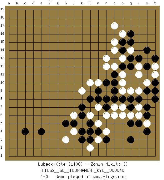 Last move : 1-0 2007 October 21 1:35:49 [Event "FICGS__GO__TOURNAMENT_KYU__000040"] [Site "FICGS"] [Date "2007.07.25"] [Round "1"] [Black "Lubeck,Kate"] [White "Zonin,Nikita"] [Result "1-0"] [Rating 1 "1100"] 1.q16 p16 2.p15 o17 3.q3 n13 4.q12 p13 5.q13 o15 6.p14 o14 7.c4 p10 8.p12 o12 9.o11 p11 10.o13 n12 11.o10 p9 12.o9 p7 13.o8 n6 14.p8 r9 15.q8 q9 16.r8 s10 17.s12 s8 18.s7 r7 19.q7 r6 20.s6 s5 21.r5 q6 22.s4 p6 23.q5 o6 24.t8 t9 25.s9 m7 26.t10 r11 27.m9 m5 28.k4 l6 29.e4 k9 30.l8 l10 31.k7 j6 32.k6 k5 33.j5 l4 34.k3 n9 35.n10 n8 36.m8 m10 37.n7 j4 38.h5 h3 39.l3 m3 40.l5 p13 41.m4 n4 42.l4 r12 43.r13 t11 44.t9 s13 45.s14 o7 46.n8 q14 47.q15 t12 48.t13 l2 49.n3 1-0 This go game has been lost on time (started : 2007.07.25 20:23:31) Here are the names of the openings (joseki) played in the four corners : Corner q16 : q16 p16 Hoshi (Hwajeom, Seongjeom, Xingwei`) 4-4 Point. The star or hoshi (4-4) point, emphasizing influence at the potential expense of territory. Corner q4 : q3 p9 Komoku (Somok, Xiao~mu`) 3-4 Point. The komoku (3-4) point is the traditional corner enclosure move.. Player Black won this Go (weiqi, baduk) game. Follow this game move after move (download)You don't have to be really good anymore to get good results. What's happening with chess is that it's gradually losing its place as the par excellence of intellectual activity. Smart people in search of a challenging board game might try a game called Go. (Hans Berliner, The New York Times, 2003) Thus, what is of supreme importance in war is to attack the enemy's strategy. (Sun Tzu)