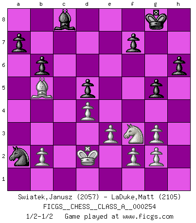 Last move : 1/2-1/2 2022 January 25 17:13:24 [Event "FICGS__CHESS__CLASS_A__000254"] [Site "FICGS"] [Date "2021.12.30"] [Round "1"] [White "Swiatek,Janusz"] [Black "LaDuke,Matt"] [Result "1/2-1/2"] [WhiteElo "2057"] [BlackElo "2105"] 1.d4 Nf6 2.c4 e6 3.Nf3 d5 4.Nc3 Bb4 5.cxd5 exd5 6.Bg5 O-O 7.e3 h6 8.Bh4 Bf5 9.Qb3 Bxc3+ 10.Qxc3 g5 11.Bg3 Ne4 12.Qxc7 Nc6 13.Qxd8 Rfxd8 14.Bb5 Rac8 15.Ke2 Nb4 16.Rhc1 Rxc1 17.Rxc1 Nxa2 18.Rc7 Nxg3+ 19.hxg3 Rc8 20.Rc5 b6 21.Rxc8+ Bxc8 22.Kd2 1/2-1/2 Queen's pawn game Kingside Castling by player Black (move 6) This chess game ended in a draw. Follow this game move after move (download)I play correspondence chess because it is both art and science while chess is art only. (A player at FICGS) Es hat in meinem Leben Zeiten gegeben, da ich sehr nahe daran war zu glauben, daß ich auch nicht eine einzige Schachpartie verlieren könnte. (José Raúl Capablanca) En posiciones complicadas, Bobby Fischer pocas veces tuvo que temer de cualquiera. (Paul Keres) Le temps de noter son nom sur la feuille de partie, j'étais déjà en zeitnot ! D'un modeste amateur apparié lors de la première ronde d'un open contre le grand-maître Azmaïparashvili. I have opinions of my own - strong opinions - but I don't always agree with them. (George Bush)
