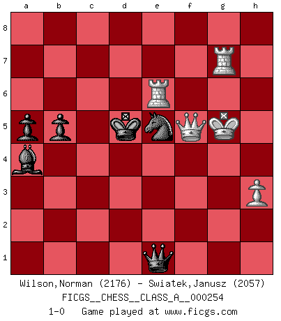 Last move : 1-0 2022 February 16 15:4:0 [Event "FICGS__CHESS__CLASS_A__000254"] [Site "FICGS"] [Date "2021.12.30"] [Round "1"] [White "Wilson,Norman"] [Black "Swiatek,Janusz"] [Result "1-0"] [WhiteElo "2176"] [BlackElo "2057"] 1.e4 e5 2.Nf3 Nc6 3.Bb5 Nf6 4.O-O Nxe4 5.d4 Nd6 6.Bxc6 dxc6 7.dxe5 Nf5 8.Qxd8+ Kxd8 9.Rd1+ Ke8 10.Nc3 Ne7 11.a4 Ng6 12.h3 a5 13.Be3 h5 14.Rd2 h4 15.Nd4 Nxe5 16.Re1 Nc4 17.Bg5 Kd7 18.Rde2 Nxb2 19.Nf5 c5 20.Re8 Nc4 21.Rd1+ Kc6 22.Nb5 Bxf5 23.Rxa8 Bxc2 24.Na7+ Kb6 25.Nc8+ Kc6 26.Na7+ Kb6 27.Rc1 Na3 28.Nc8+ Kc6 29.Be7 Kd7 30.Bxf8 Rxf8 31.Nb6+ cxb6 32.Rxf8 Bb3 33.g3 Nc2 34.gxh4 Ke6 35.Rb8 Bxa4 36.Rxb7 b5 37.f4 c4 38.Kf2 Nb4 39.f5+ Kxf5 40.Rg1 Kf6 41.Rb6+ Ke5 42.Rxg7 Kd4 43.h5 Nd3+ 44.Kg3 c3 45.Rd6+ Ke3 46.h6 c2 47.h7 c1Q 48.h8Q Qc3 49.Qh6+ Ke4 50.Qh7+ f5 51.Re6+ Ne5 52.Kh4 Qe1+ 53.Kg5 Kd5 54.Qxf5 1-0 Ruy Lopez : Berlin defense, Open variation Kingside Castling by player White (move 4) Promotion Queen by player Black (move 47) Promotion Queen by player White (move 48) Player White won this chess game. Follow this game move after move (download)A bad plan is better than none at all. (Frank Marshall) Gegen einen Schachcomputer zu verlieren ist wie Löcher in den Strümpfen zuhaben. Es ist nicht peinlich, solange man der einzige ist der es weiß. (Anonymous) La partida mas dura de ganar es una partida ganada. (Emanuel Lasker) C'est la seule position que je connaisse où les deux camps sont mals. Propos prêtés à V. Anand. Depression is just anger without enthusiasm. (Unknown)