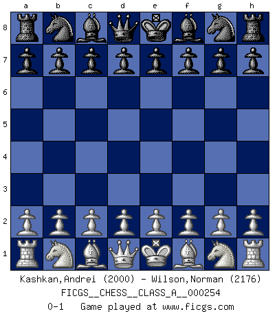 Last move : 0-1 2022 February 8 15:38:27 [Event "FICGS__CHESS__CLASS_A__000254"] [Site "FICGS"] [Date "2021.12.30"] [Round "1"] [White "Kashkan,Andrei"] [Black "Wilson,Norman"] [Result "0-1"] [WhiteElo "2000"] [BlackElo "2176"] 0-1 This chess game has been lost on time (started : 2021.12.30 15:11:35) Player Black won this chess game. Follow this game move after move (download)It is always better to sacrifice your opponent's men. (Savielly Tartakower) Die Elozahlen sind sehr schlecht für das Schach. Jetzt ist Schach eine Sportindustrie, die darauf zielt Elopunkte zu machen. (Miguel Najdorf) Debemos de asegurarnos de que el Ajedrez no se convierta en un lenguaje muerto, muy interesante, pero solo para un grupo muy pequeño. (Sytze Faber) Vous savez, camarade Pachman, je n'éprouve pas de plaisir à être ministre, je jouerais plutôt aux échecs comme vous, ou alors ferais une révolution au Venezuela. (Che Guevara à Ludek Pachman, 'Checkmate in Prague', 1975) Men should grow up. - Yeah. And dogs should stop licking themselves. It's not gonna happen. (Gregory House to Dr. Cameron, House M.D.)