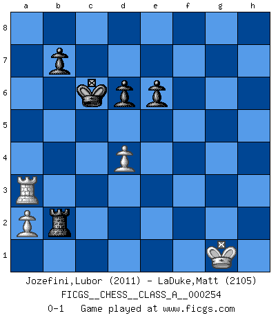 Last move : 0-1 2022 September 9 12:7:55 [Event "FICGS__CHESS__CLASS_A__000254"] [Site "FICGS"] [Date "2021.12.30"] [Round "1"] [White "Jozefini,Lubor"] [Black "LaDuke,Matt"] [Result "0-1"] [WhiteElo "2011"] [BlackElo "2105"] 1.e4 e5 2.f4 exf4 3.Nf3 d6 4.d4 g5 5.g3 Bg7 6.Rg1 g4 7.gxf4 Bf6 8.e5 Bh4+ 9.Nxh4 Qxh4+ 10.Rg3 Qxh2 11.Rg2 Qh4+ 12.Rf2 Ne7 13.Bg2 g3 14.Rf1 Qh2 15.Qf3 Bg4 16.Qxg4 Qxg2 17.Nc3 h5 18.Qg5 Qxc2 19.Qxg3 Nbc6 20.Rf2 Qf5 21.Qf3 O-O-O 22.Be3 Nb4 23.Kf1 h4 24.Ne4 h3 25.Kg1 h2+ 26.Kh1 Rh3 27.Ng3 Qe6 28.f5 Nxf5 29.Qxf5 Rxg3 30.Qxe6+ fxe6 31.Bd2 Nd3 32.Rxh2 Rf8 33.Rg1 Nf2+ 34.Rxf2 Rxf2 35.Rxg3 Rxd2 36.exd6 Rxb2 37.Ra3 cxd6 38.Rxa7 Kc7 39.Kg1 Kb6 40.Ra3 Kc6 0-1 KGA : Fischer defense Queenside Castling by player Black (move 21) 10 pieces endgame at move 37 : White KRPP , Black KRPPPP WHITE : King + 1 Rook 2 Pawns BLACK : King + 1 Rook 4 Pawns 9 pieces endgame at move 38 : White KRPP , Black KRPPP WHITE : King + 1 Rook 2 Pawns BLACK : King + 1 Rook 3 Pawns Player Black won this chess game. Follow this game move after move (download)Of all my Russian books, the defense contains and diffuses the greatest 'warmth' which may seem odd seeing how supremely abstract Chess is supposed to be. (Vladimir Nabokov) Der Traum, für den ich lebe, ist der von einem freien Russland. Viele mögen sagen: Russland hat doch ein Parlament, einen gewählten Präsidenten. Aber ich spüre, dass in meiner Heimat die Angst wiederkehrt. Eine Angst, sich frei zu äußern, bestimmte Dinge zu tun (Garry Kasparov) Con el fin de mejorar tu juego, debes de estudiar los finales antes que todo, ya que mientras que los finales pueden ser estudiados y dominados por sí mismos, el juegomedio y la apertura deben de ser estudiados en relación con los finales. (José Raúl Capablanca) Les Echecs mettent en conflit, non pas deux intelligences, mais deux volontés. (Lasker) To err is human, to shift the blame on someone else is tactical. (Mladen Jankovic)