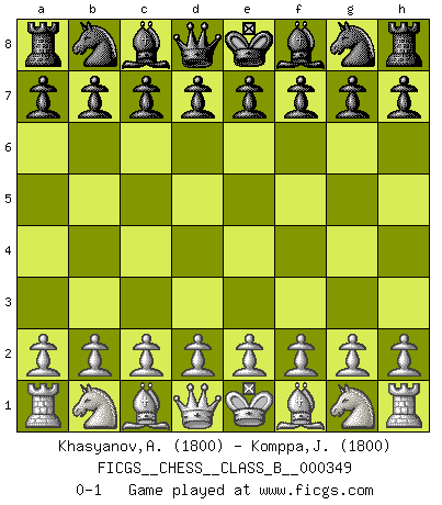 Last move : 0-1 2022 February 11 12:21:50 [Event "FICGS__CHESS__CLASS_B__000349"] [Site "FICGS"] [Date "2022.01.02"] [Round "1"] [White "Khasyanov,Airat"] [Black "Komppa,Jormaveikko"] [Result "0-1"] [WhiteElo "1800"] [BlackElo "1800"] 0-1 This chess game has been lost on time (started : 2022.01.02 8:20:44) Player Black won this chess game. Follow this game move after move (download)It is peculiar but a fact nevertheless, that gamblers in chess always have enthusiastic followers. (Botvinnik) Ich hatte meine größten Erfolge, als ich 47 Jahre alt war. Kasparow war noch nicht mal 42 und hat das Schach schon im Stich gelassen. (Viktor Kortschnoi) No es tiempo de jugar al Ajedrez cuando la casa esta en llamas. (Proverbio Italiano) Si je n'étais pas joueur d'échecs, je serais le meilleur dans quelque chose d'autre. (Anatoli Karpov) Art disturbs, science reassures. (Georges Braque, Le Jour et la Nuit)