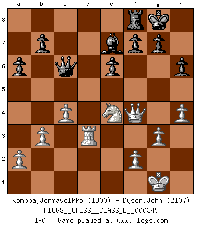 Last move : 1-0 2022 July 2 1:5:16 [Event "FICGS__CHESS__CLASS_B__000349"] [Site "FICGS"] [Date "2022.01.02"] [Round "1"] [White "Komppa,Jormaveikko"] [Black "Dyson,John"] [Result "1-0"] [WhiteElo "1800"] [BlackElo "2107"] 1.e4 c5 2.Nf3 e6 3.c3 Nf6 4.e5 Nd5 5.g3 d6 6.exd6 Nc6 7.Bg2 Bxd6 8.O-O O-O 9.d4 cxd4 10.Nxd4 Nxd4 11.Qxd4 Qc7 12.c4 Nf6 13.Nc3 Bd7 14.b3 Bc5 15.Qh4 Bc6 16.Bg5 Be7 17.Qf4 Qc8 18.Rad1 h6 19.Bxf6 Bxf6 20.Bxc6 Qxc6 21.Ne4 Be7 22.Rd3 Rad8 23.Rfd1 Rxd3 24.Rxd3 a6 25.h4 1-0 This chess game has been lost on time (started : 2022.01.02 8:20:44) Sicilian defense Kingside Castling by player White (move 8) Kingside Castling by player Black (move 8) Player White won this chess game. Follow this game move after move (download)A Chess game is divided into three stages: the first, when you hope you have the advantage, the second when you believe you have an advantage, and the third... when you know you're going to lose ! (Savielly Tartakower) Konzentriere dich auf materielle Gewinne. Nimm, was dir dein Gegner gibt, ausser es gibt einen guten Grund der dagegenspricht. (Robert James Fischer) Morphy probablemente fue el genio más grande de todos. (Bobby Fischer) L'attaque fait le spectacle, la défense gagne les matchs. (Dicton footballistique) It's not enough to succeed. Others must fail. (Gore Vidal)