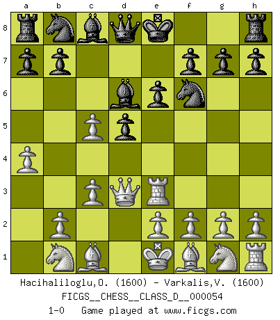 Last move : 1-0 2007 September 9 19:35:52 [Event "FICGS__CHESS__CLASS_D__000054"] [Site "FICGS"] [Date "2007.07.27"] [Round "1"] [White "Hacihaliloglu,Ozlem"] [Black "Varkalis,Valdas"] [Result "1-0"] [WhiteElo "1600"] [BlackElo "1600"] 1.a4 d5 2.Ra3 e6 3.Re3 Bc5 4.d4 Bb4+ 5.c3 Bd6 6.Qd3 Nf6 7.Qb5+ c6 8.Qd3 c5 9.dxc5 1-0 This chess game has been lost on time (started : 2007.07.27 3:3:0) Ware (Meadow Hay) Opening Player White won this chess game. Follow this game move after move (download)Everything is in a state of flux, and this includes the world of Chess. (Mikhail Botvinnik) Es hat in meinem Leben Zeiten gegeben, da ich sehr nahe daran war zu glauben, daß ich auch nicht eine einzige Schachpartie verlieren könnte. (José Raúl Capablanca) Existen dos clases de sacrificios: los correctos y los míos. (Mikhail Tal) Le joueur d'Echecs qui veut atteindre le top est obligé de développer son propre credo créatif. Alexeï Stepanovicth Souétine. Il est facile d'écrire des livres ! Ce qui est difficile, c'est de jouer ! (Alexeï Stepanovicth Souétine) Who needs drugs and alcohol if he can play Big Chess at FICGS ? (Heinz-Georg Lehnhoff)