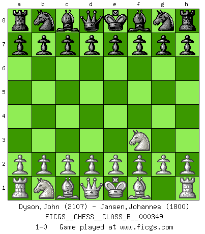 Last move : 1-0 2022 February 11 12:21:50 [Event "FICGS__CHESS__CLASS_B__000349"] [Site "FICGS"] [Date "2022.01.02"] [Round "1"] [White "Dyson,John"] [Black "Jansen,Johannes"] [Result "1-0"] [WhiteElo "2107"] [BlackElo "1800"] 1.Nf3 1-0 This chess game has been lost on time (started : 2022.01.02 8:20:44) Reti Opening Player White won this chess game. Follow this game move after move (download)Chess is a cold bath for the mind. (Sir John Simon) Die Idee von Capablanca, Schach als Fach in den Schulen zu lehren, ist großartig. (Fidel Castro) Sin errores no puede haber brillantez. (Emanuel Lasker) Le temps de noter son nom sur la feuille de partie, j'étais déjà en zeitnot ! D'un modeste amateur apparié lors de la première ronde d'un open contre le grand-maître Azmaïparashvili. Mandala - that's it! 16x16 squares as multiple of the four and the eight because of the Four Noble Truths and the Noble Eightfold Path. (Heinz-Georg Lehnhoff about Big Chess)