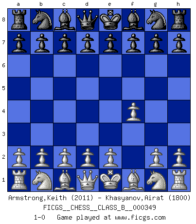 Last move : 1-0 2022 February 11 12:21:50 [Event "FICGS__CHESS__CLASS_B__000349"] [Site "FICGS"] [Date "2022.01.02"] [Round "1"] [White "Armstrong,Keith"] [Black "Khasyanov,Airat"] [Result "1-0"] [WhiteElo "2011"] [BlackElo "1800"] 1.f4 1-0 This chess game has been lost on time (started : 2022.01.02 8:20:44) Bird's Opening Player White won this chess game. Follow this game move after move (download)Openings teach you openings. Endgames teach you chess ! (Stephan Gerzadowicz) Ein Teil des Fehlers ist immer korrekt. (Savielly Grigorievitsch Tartakower) El Ajedrez te enseña a controlarl la excitación inicial que sientes cuando vez algo que parece bueno y te enseña a pensar objetivamente cuando te encuentras en problemas. (Stanley Kubrick) Karpov est une pièce de musée. (Garry Kasparov) Luck is when opportunity knocks and you answer. (Anonymous)