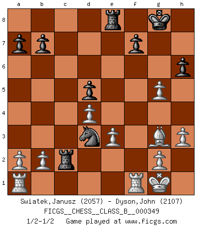 Last move : 1/2-1/2 2022 February 24 22:24:24 [Event "FICGS__CHESS__CLASS_B__000349"] [Site "FICGS"] [Date "2022.01.02"] [Round "1"] [White "Swiatek,Janusz"] [Black "Dyson,John"] [Result "1/2-1/2"] [WhiteElo "2057"] [BlackElo "2107"] 1.d4 Nf6 2.c4 e6 3.Nf3 d5 4.Nc3 Bb4 5.cxd5 exd5 6.Bg5 h6 7.Bh4 O-O 8.e3 Bf5 9.Qb3 Bxc3+ 10.Qxc3 g5 11.Bg3 Ne4 12.Qxc7 Nc6 13.Qxd8 Rfxd8 14.Bb5 Rac8 15.Nd2 Nb4 16.Nxe4 Bxe4 17.O-O Bd3 18.Bxd3 Nxd3 19.h3 Rc2 20.f4 Re8 21.fxg5 1/2-1/2 Queen's pawn game Kingside Castling by player Black (move 7) Kingside Castling by player White (move 17) This chess game ended in a draw. Follow this game move after move (download)When I asked Fischer why he had not played a certain move in our game, he replied: 'Well, you laughed when I wrote it down !' (Mikhail Tal) Wer sich die Fähigkeit anerziehen will im Schach selbstständig zu denken, der muß alles meiden, was leblos ist: ausgeklügelte Theorien, die sich auf sehr wenige Beispiele und eine Menge Hirngespinste stützen. (Emanuel Lasker) Los tropiezos estan todos ahí en el tablero, esperando que se cometan. (Savielly Tartakover) J'ai vu le vaincu d'Echecs jouer des années durant dans l'espoir de la fête de la victoire. Car tu es plus riche de ce qu'elle existe si même elle n'est point pour toi. Ainsi de la perle du fond des mers. (Antoine de Saint-Exupéry) Quotation,n.: The act of repeating erroneously the words of another. The words erroneously repeated. (Ambrose Bierce, The Devil's Dictionary)