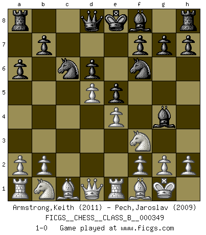 Last move : 1-0 2022 March 30 14:35:3 [Event "FICGS__CHESS__CLASS_B__000349"] [Site "FICGS"] [Date "2022.01.02"] [Round "1"] [White "Armstrong,Keith"] [Black "Pech,Jaroslav"] [Result "1-0"] [WhiteElo "2011"] [BlackElo "2009"] 1.e4 c5 2.Nf3 Nc6 3.Bb5 d6 4.O-O Bd7 5.Re1 Nf6 6.c3 a6 7.Bf1 Bg4 8.d4 cxd4 9.cxd4 e5 10.d5 1-0 This chess game has been lost on time (started : 2022.01.02 8:20:44) Sicilian : Nimzovich-Rossolimo attack (without ...d6) Kingside Castling by player White (move 4) Player White won this chess game. Follow this game move after move (download)Not only will I predict his triumph over Botvinnik, but I'll go further and say that he'll probably be the greatest Chess player that ever lived. (John Collins) Spiel ein langweiliges Spiel zu Ende und lustige Dinge können passieren. (Hans Ree) El Ajedrez, como cualquier actividad creativa, solo puede existir a través del esfuerzo combinado de aquellos que tienen talento creativo y de aquellos que poseen la habilidad de organizar su trabajo creativo. (Mikhail Botvinnik) Vous m'avez demandé de vous exposer quel est le fondement de la prière. Je ne fais que préparer les pièces du jeu sur la table... Nous sera-t-il permis d'en adopter les règles et si nous les appliquons scrupuleusement nous ne tarderons pas à faire mat le Roi divin ! Il ne pourra échapper à nos mains. (Sainte Thérèse d'Avila, Chemin de perfection) Pushing plastic is for the many, pushing virtual pieces is for the fewer, pushing wood is for the very few. (Normajean Yates)
