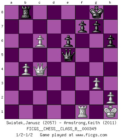 Last move : 1/2-1/2 2022 February 16 22:39:28 [Event "FICGS__CHESS__CLASS_B__000349"] [Site "FICGS"] [Date "2022.01.02"] [Round "1"] [White "Swiatek,Janusz"] [Black "Armstrong,Keith"] [Result "1/2-1/2"] [WhiteElo "2057"] [BlackElo "2011"] 1.d4 Nf6 2.c4 e6 3.Nf3 d5 4.Nc3 c6 5.Bg5 h6 6.Bxf6 Qxf6 7.e3 Nd7 8.Be2 Bd6 9.O-O Qe7 10.e4 dxe4 11.Nxe4 Bc7 12.c5 O-O 13.Re1 Ba5 14.Rf1 Bc7 15.Re1 Ba5 16.Ned2 b6 17.a3 bxc5 18.dxc5 Bc7 19.b4 a5 20.Nc4 Ba6 21.Nd4 Bxc4 22.Nxc6 Qh4 23.g3 Bxe2 24.Qxd7 Bxg3 25.fxg3 Qh5 26.Qd4 axb4 27.axb4 Rxa1 28.Rxa1 Qf3 29.Qd2 Qxc6 30.Qxe2 Rb8 31.Qc4 Qf3 32.Rf1 Qe3+ 33.Kh1 Qe5 34.Kg1 Qe3+ 35.Kh1 Qe5 36.c6 1/2-1/2 Queen's pawn game Kingside Castling by player White (move 9) Kingside Castling by player Black (move 12) This chess game ended in a draw. Follow this game move after move (download)In complicated positions, Bobby Fischer hardly had to be afraid of anybody. (Paul Keres) Schach ist das Spiel, das die Verrückten gesund hält. (Albert Einstein) El Ajedrez expande y enriquece tu mente. (Saudin Robovic) Demandez au pauvre Cg1 ce qu'il en pense. Eduard Gufeld à propos de la variante Saemisch de l'Est-Indienne. A shortcut is the longest distance between two points. (Don Groves)