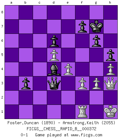 Last move : 0-1 2022 April 9 16:56:47 [Event "FICGS__CHESS__RAPID_B__000372"] [Site "FICGS"] [Date "2022.01.03"] [Round "1"] [White "Foster,Duncan"] [Black "Armstrong,Keith"] [Result "0-1"] [WhiteElo "1890"] [BlackElo "2055"] 1.e4 d6 2.d4 Nf6 3.f3 c5 4.d5 e6 5.c4 g6 6.Nc3 Bg7 7.Bg5 O-O 8.Qd2 exd5 9.cxd5 a6 10.a4 Qc7 11.Be2 Re8 12.a5 b5 13.axb6 Qxb6 14.Nd1 a5 15.Ne3 Ba6 16.Bxa6 Qxa6 17.Ne2 Nbd7 18.O-O Ne5 19.Ra3 Reb8 20.Rfa1 Rb4 21.b3 Qb6 22.Nc3 c4 23.Na4 Qa7 24.Nb2 Qb6 25.Na4 Qb7 26.bxc4 Nxc4 27.Nxc4 Rxc4 28.Qd3 Rac8 29.Rb1 Rb4 30.Rab3 Nd7 31.Bd2 Ne5 32.Rxb4 axb4 33.Qb3 Qa6 34.Nb2 Qa3 35.Nd1 Nd3 36.h4 h5 37.Ne3 Bd4 38.Kh2 Be5+ 39.Kh1 Qa6 40.Nc2 Rxc2 41.Qxc2 Nf2+ 42.Kg1 Qe2 43.Re1 Nh3+ 44.Kh1 Qf2 45.Qc8+ Kg7 46.Qxh3 Qxd2 47.Rg1 Bd4 48.Rf1 Qd3 49.g3 b3 0-1 King's pawn Opening Kingside Castling by player Black (move 7) Kingside Castling by player White (move 18) Player Black won this chess game. Follow this game move after move (download)I thought the most common mistake [in chess] was the first one: Learning the game :P (Garvin Gray, FICGS forum) Schach ist ein Teil der Kultur, und wenn es mit der Kultur abwärts geht, geht es auch mit dem Schach abwärts. (Mikhail Moiseyevich Botvinik) El Ajedrez moderno está demasiado preocupado con cosas como la estructura de Peones. Olvidenlo, el Jaque Mate termina la partida. (Nigel Short) On entre au jeu d'Echecs comme on entre en Religion. Pour le joueur d'Echecs, la partie d'Echecs c'est l'office, la messe, le défilé du 1er Mai, le dépôt de gerbe au Monument aux Morts. C'est un drame sacré. (Michel Roos) The existence of forgetting has never been proved: We only know that some things don't come to mind when we want them. (Friedrich Nietzsche)
