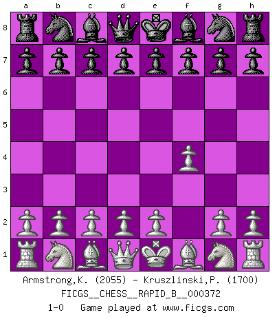 Last move : 1-0 2022 February 2 3:53:32 [Event "FICGS__CHESS__RAPID_B__000372"] [Site "FICGS"] [Date "2022.01.03"] [Round "1"] [White "Armstrong,Keith"] [Black "Kruszlinski,Patryk"] [Result "1-0"] [WhiteElo "2055"] [BlackElo "1700"] 1.f4 1-0 This chess game has been lost on time (started : 2022.01.03 0:23:25) Bird's Opening Player White won this chess game. Follow this game move after move (download)Look at Garry Kasparov. After he loses, invariably he wins the next game. He just kills the next guy. That's something that we have to learn to be able to do. (Maurice Ashley) Deine Wertungszahl - vorausgesetzt einige Jahre schachliche Anstrengung - entspricht etwa dem zehnfachen Deines IQ plus 1000. (Jonathan Levitt) La pasion por jugar al Ajedrez es una de las mas inexplicables en el mundo. (H.G. Wells) Des combinaisons [dans le jeu d'échecs] pareilles à des mélodies. Je crois entendre pour ainsi dire la musique des coups... (Vladimir Nabokov) History is a gallery of pictures in which there are few originals and many copies. (Alexis de Tocqueville)