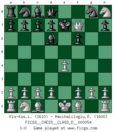 Last move : 1-0 2007 August 11 22:25:39 [Event "FICGS__CHESS__CLASS_D__000054"] [Site "FICGS"] [Date "2007.07.27"] [Round "1"] [White "Kis-Kos,Laszlo"] [Black "Hacihaliloglu,Ozlem"] [Result "1-0"] [WhiteElo "1610"] [BlackElo "1600"] 1.e4 e5 2.Nf3 Be7 3.Nxe5 f6 4.Qh5+ g6 5.Nxg6 Bd6 6.Nxh8 Ke7 7.Qf7+ 1-0 King's knight Opening Player White won this chess game. Follow this game move after move (download)Help your pieces so they can help you. (Paul Morphy) Viele Opfer benötigen überhaupt keine konkrete Berechnung. Es genügt sich die entstehende Position kurz vorzustellen, um uns davon zu überzeugen, dass das Opfer korrekt ist. (Mikhail Nekhemyevich Tal) Los finales de Peón son del Ajedrez lo que el cesped es del Golf. (Cecil Purdy) Les écrivains ont utilisé les échecs pour analyser les côtés extrêmes de la nature humaine. Dans ce cadre, les échecs offrent un champ d'expérimentation idéal. Mais on pourrait faire la même chose avec la peinture. Et là, en vous référant à Van Gogh, vous ne tirerez pas de conclusion définitive sur les peintres. (Gary Kasparov) I believe in luck. How else can you explain the success of those you dislike ? (Jean Cocteau)