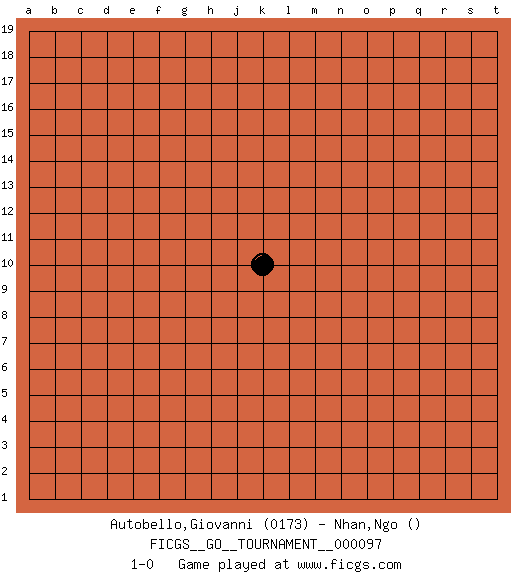 Last move : 1-0 2022 February 5 0:39:1 [Event "FICGS__GO__TOURNAMENT__000097"] [Site "FICGS"] [Date "2022.01.05"] [Round "1"] [Black "Autobello,Giovanni"] [White "Nhan,Ngo"] [Result "1-0"] [Rating 1 "0173"] 1.k10 1-0 This go game has been lost on time (started : 2022.01.05 8:38:19) Here are the names of the openings (joseki) played in the four corners : Player Black won this Go (weiqi, baduk) game. Follow this game move after move (download)Against three in a row, play right in the center. (Anonymous) The Internet isn't free. It just has an economy that makes no sense to capitalism. (Brad Shapcott)