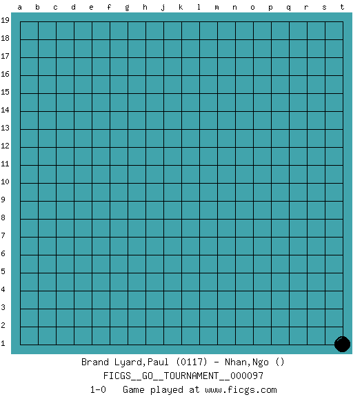 Last move : 1-0 2022 February 4 12:5:43 [Event "FICGS__GO__TOURNAMENT__000097"] [Site "FICGS"] [Date "2022.01.05"] [Round "1"] [Black "Brand Lyard,Paul"] [White "Nhan,Ngo"] [Result "1-0"] [Rating 1 "0117"] 1.t1 1-0 This go game has been lost on time (started : 2022.01.05 8:38:19) Here are the names of the openings (joseki) played in the four corners : Corner q4 : t1 1-0 This joseki is unknown. A weak or weird move has probably been played in this corner. Player Black won this Go (weiqi, baduk) game. Follow this game move after move (download)In the corner, five stones in a row on the third line are alive. (Anonymous) Those parts of the system that you can hit with a hammer (not advised) are called hardware; those program instructions that you can only curse at are called software. (Anonymous)