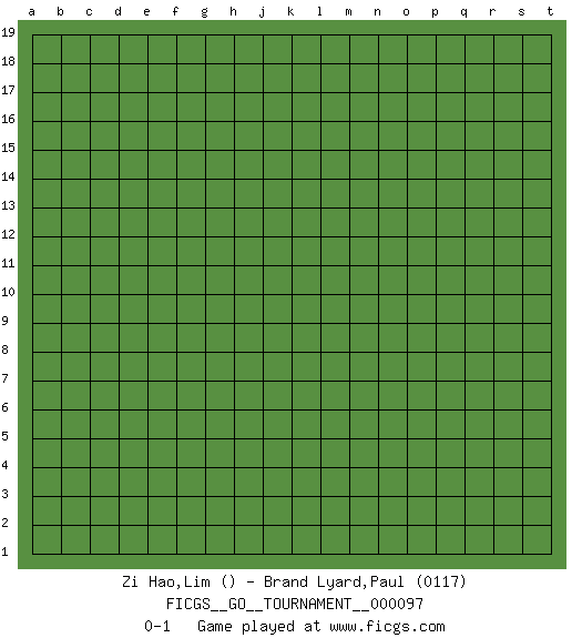 Last move : 0-1 2022 February 4 12:5:43 [Event "FICGS__GO__TOURNAMENT__000097"] [Site "FICGS"] [Date "2022.01.05"] [Round "1"] [Black "Zi Hao,Lim"] [White "Brand Lyard,Paul"] [Result "0-1"] [Rating 2 "0117"] 0-1 This go game has been lost on time (started : 2022.01.05 8:38:19) Here are the names of the openings (joseki) played in the four corners : Player White won this Go (weiqi, baduk) game. Follow this game move after move (download)Proverbs do not apply to White. (Tero Sand) Think like a man of action, act like a man of thought. (Henri Louis Bergson)