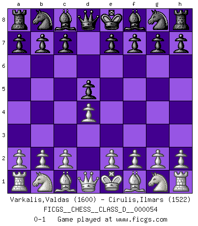 Last move : 0-1 2007 September 12 14:4:17 [Event "FICGS__CHESS__CLASS_D__000054"] [Site "FICGS"] [Date "2007.07.27"] [Round "1"] [White "Varkalis,Valdas"] [Black "Cirulis,Ilmars"] [Result "0-1"] [WhiteElo "1600"] [BlackElo "1522"] 1.d4 d5 0-1 This chess game has been lost on time (started : 2007.07.27 3:3:0) Queen's pawn game Player Black won this chess game. Follow this game move after move (download)Bobby is the most misunderstood, misquoted celebrity walking the face of this earth. (Yasser Seirawan) Zeige mir drei Eröffnungsvarianten und ich beweise dir, dass zwei davon inkorrekt sind. (Emanuel Lasker) Bobby es el jugador de Ajedrez mas fino que este país jamás haya producido. Su memoria para las movidas, su brillantez en soñar combinaciones y su feróz determinación por la victoria son algo extraño. (John Collins) Assurément je connaissais par expérience le mystérieux attrait de ce jeu royal, le seul entre tous les jeux inventés par les hommes qui échappe souverainement à la tyrannie du hasard, le seul où l'on ne doive sa victoire qu'à son intelligence ou plutôt à une certaine forme d'intelligence. Mais n'est-ce pas déjà le limiter injurieusement que d'appeler les échecs un jeu ? N'est-ce pas une science, un art ou quelque chose qui, comme le cercueil de Mahomet entre ciel et terre, est suspendu entre l'un et l'autre, et qui réunit un nombre incroyable de contraires ? [...] C'est une pensée qui ne mène à rien, une mathématique qui n'établit rien, un art qui ne laisse pas d'uvre, une architecture sans matière; et il l'a prouvé néanmoins qu'il était plus durable, à sa manière, que les livres ou que tout autre monument, ce jeu unique qui appartient à tous les peuples et à tous les temps, et dont personne ne sait quel dieu en fit don à la terre pour tuer l'ennui, pour aiguiser l'esprit et stimuler l'âme. Où commence-t-il, où finit-il ? (Stefan Zweig) Train yourself to let go of everything you fear to lose. (Master Yoda in Star Wars ep.3)