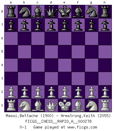 Last move : 0-1 2022 February 7 13:37:43 [Event "FICGS__CHESS__RAPID_A__000278"] [Site "FICGS"] [Date "2022.01.08"] [Round "1"] [White "Massi,Bettache"] [Black "Armstrong,Keith"] [Result "0-1"] [WhiteElo "1900"] [BlackElo "2055"] 0-1 This chess game has been lost on time (started : 2022.01.08 1:46:7) Player Black won this chess game. Follow this game move after move (download)Spassky will not be psyched out by Fischer. (Mike Goodall) Ich liebe den Moment, wenn ich das Ego meines Gegenüber breche. (Robert James Fischer) El juego de Fischer siempre fue nítido, racional y brillante. Uno de los mejores por siempre. (Dave Regis) On entre au jeu d'Echecs comme on entre en Religion. Pour le joueur d'Echecs, la partie d'Echecs c'est l'office, la messe, le défilé du 1er Mai, le dépôt de gerbe au Monument aux Morts. C'est un drame sacré. (Michel Roos) Treat your password like your toothbrush. Don't let anybody else use it, and get a new one every six months. (Clifford Stoll)