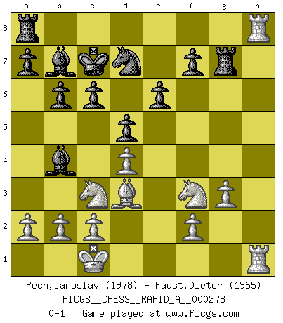 Last move : 0-1 2022 April 15 17:43:26 [Event "FICGS__CHESS__RAPID_A__000278"] [Site "FICGS"] [Date "2022.01.08"] [Round "1"] [White "Pech,Jaroslav"] [Black "Faust,Dieter"] [Result "0-1"] [WhiteElo "1978"] [BlackElo "1965"] 1.e4 e6 2.d4 d5 3.Nc3 Nf6 4.Bg5 Bb4 5.e5 h6 6.exf6 hxg5 7.fxg7 Rg8 8.h4 gxh4 9.Qh5 Qf6 10.Qxh4 Qxh4 11.Rxh4 Rxg7 12.Rh8+ Kd7 13.Nf3 c6 14.O-O-O Kc7 15.g3 Nd7 16.Bd3 b6 17.Rdh1 Bb7 0-1 This chess game has been lost on time (started : 2022.01.08 1:46:7) French : MacCutcheon, Chigorin variation Queenside Castling by player White (move 14) Player Black won this chess game. Follow this game move after move (download)Some part of a mistake is always correct. (Savielly Tartakover) Die Fehler sind da, Sie warten nur darauf gemacht zu werden. (Savielly Grigorievitsch Tartakower) En el Ajedrez, cuando menos, el valiente hereda la tierra. (Edmar Mednis) Il a essayé de se convaincre qu'il pourrait empêcher toutes les erreurs et ne jamais perdre. L'horreur ! Gary Kasparov au sujet de Robert Fischer. Warrior pose battles inner weakness and wins focus. You see that there is no war within you. You're on your own side, and you are your own strength. (Terri Guillemets)