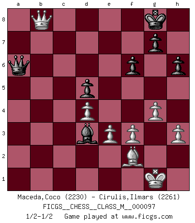 Last move : 1/2-1/2 2022 February 26 23:30:28 [Event "FICGS__CHESS__CLASS_M__000097"] [Site "FICGS"] [Date "2022.01.08"] [Round "1"] [White "Maceda,Coco"] [Black "Cirulis,Ilmars"] [Result "1/2-1/2"] [WhiteElo "2230"] [BlackElo "2261"] 1.d4 d5 2.c4 c6 3.Nf3 Nf6 4.Nc3 e6 5.e3 Nbd7 6.Qc2 Bd6 7.Bd3 O-O 8.O-O dxc4 9.Bxc4 a6 10.Rd1 b5 11.Bd3 Qc7 12.Bd2 c5 13.Ne4 c4 14.Nxd6 Qxd6 15.Be2 Bb7 16.b3 Bd5 17.Qb2 Rfc8 18.Rac1 a5 19.Be1 cxb3 20.Rxc8+ Rxc8 21.axb3 a4 22.bxa4 bxa4 23.Ra1 Rb8 24.Qc1 Ra8 25.Ne5 Nb6 26.Bb5 Rc8 27.Qb2 Bb3 28.Rc1 Rxc1 29.Qxc1 h6 30.Nc6 Ng4 31.g3 Nc4 32.Nb4 Qb8 33.Bxa4 Bxa4 34.Qxc4 Bb5 35.Qc2 Nf6 36.f3 Nd5 37.Nxd5 exd5 38.Qb1 Qb7 39.h3 f6 40.Bf2 Qa6 41.g4 Bd3 42.Qb8+ 1/2-1/2 QGD Slav : 4.Nc3 Kingside Castling by player Black (move 7) Kingside Castling by player White (move 8) This chess game ended in a draw. Follow this game move after move (download)Of Chess it has been said that life is not long enough for it, but that is the fault of life, not Chess. (William Ewart Napier) Der Bart als Geschlechtszeichen mitten im Gesicht ist obszön. Daher gefällt er den Weibern. [Zugegeben, kein Schachzitat, aber unglaublich originell] (Arthur Schopenhauer) El juego de Damas es para vagabundos. (Paul Morphy) Les Cavaliers se révèlent fort utiles dans les positions fermées. D'habitude, les Fous sont un peu plus forts que les Cavaliers dans les positions ouvertes. Qu'on le veuille ou non, il restera toujours des exceptions ! Patience, use the Force, think ! (Obi-Wan Kenobi in Star Wars ep.2)