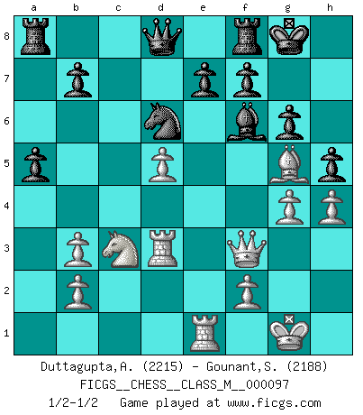 Last move : 1/2-1/2 2022 March 15 14:31:32 [Event "FICGS__CHESS__CLASS_M__000097"] [Site "FICGS"] [Date "2022.01.08"] [Round "1"] [White "Duttagupta,Aniruddha"] [Black "Gounant,Stanislas"] [Result "1/2-1/2"] [WhiteElo "2215"] [BlackElo "2188"] 1.c4 c6 2.e4 d5 3.exd5 cxd5 4.cxd5 Nf6 5.Nc3 Nxd5 6.Nf3 g6 7.Bc4 Nb6 8.Bb3 Bg7 9.O-O O-O 10.d4 Bg4 11.d5 N8d7 12.h3 Bxf3 13.Qxf3 Nc5 14.Rd1 Nxb3 15.axb3 Nc8 16.Rd3 a5 17.h4 h5 18.Bg5 Nd6 19.Re1 Bf6 20.g4 1/2-1/2 English : Caro-Kann defensive system Kingside Castling by player White (move 9) Kingside Castling by player Black (move 9) This chess game ended in a draw. Follow this game move after move (download)The defensive power of a pinned piece is only imaginary. (Aaron Nimzovich) Garry Kasparov war erst in der Großmeister-Organisation GMA, dann in der Profischach-Vereinigung PCA, zum Schluss kehrte er wieder in den Schoß der FIDE zurück. Aber gut, manche Leute sind flexibel (Viswanathan Anand) Ciertamente, de todas la drogas del mundo, el Ajedrez debe ser el mas placentero permamentemente. (Assiac) Je ne suis pas le dernier à jouer lâchement des coups douteux pendant le zeïtnot de l'adversaire pour l'achever: en effet les coups qui font le plus peur sont ceux que l'on ne comprend pas. Je me fais souvent peur quand je joue. (Un professeur anonyme) It is not enough to be a good player... you must also play well. (Siegbert Tarrasch)