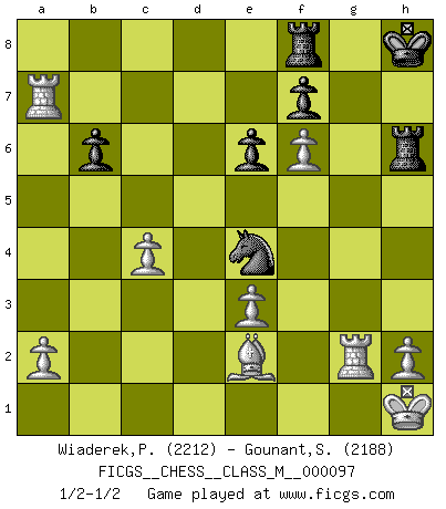 Last move : 1/2-1/2 2022 February 22 14:46:28 [Event "FICGS__CHESS__CLASS_M__000097"] [Site "FICGS"] [Date "2022.01.08"] [Round "1"] [White "Wiaderek,Piotr"] [Black "Gounant,Stanislas"] [Result "1/2-1/2"] [WhiteElo "2212"] [BlackElo "2188"] 1.d4 d5 2.c4 c6 3.Nf3 Nf6 4.e3 e6 5.b3 Nbd7 6.Bd3 Bd6 7.Bb2 b6 8.O-O O-O 9.Nbd2 Bb7 10.Re1 c5 11.cxd5 Nxd5 12.Nc4 Be7 13.Bf1 N5f6 14.Qe2 h6 15.Red1 Rc8 16.Rac1 Bd5 17.dxc5 Rxc5 18.Qe1 Re8 19.Nd4 Qb8 20.f3 Ne5 21.Qg3 Bxc4 22.bxc4 Nh5 23.Qh3 Nf6 24.Nb3 R5c8 25.f4 Ng6 26.Bd3 Nf8 27.Qf3 N8d7 28.g4 Nc5 29.Be2 Nfd7 30.Nxc5 Nxc5 31.g5 hxg5 32.Qh5 Bf6 33.Bxf6 gxf6 34.fxg5 Qe5 35.gxf6 Qxh5 36.Bxh5 Ne4 37.Rd7 Rf8 38.Rf1 Rc5 39.Be2 Rg5+ 40.Kh1 Rg6 41.Rxa7 Rh6 42.Rg1+ Kh8 43.Rg2 1/2-1/2 QGD Slav : 4.e3 Kingside Castling by player White (move 8) Kingside Castling by player Black (move 8) This chess game ended in a draw. Follow this game move after move (download)Only sissies Castle. (Rob Sillars) Wenn Du absolut nicht mehr weißt, was Du tun sollst, dann ist es Zeit für Panik. (John van der Wiel) Siempre es mucho mejor sacrificar las piezas de tu oponente. (Savielly Tartakover) C'est une question de caractère, Beaucoup de gens perdent leur motivation très vite. D'autres, ils sont rares, peuvent la conserver très longtemps. J'aime les échecs, encore aujourd'hui je suis heureux d'analyser des parties. J'aime toujours gagner, je déteste encore perdre. Bien jouer est important pour mon intégrité intellectuelle et morale. Et puis les échecs vivent en ce moment une période historique grâce à Internet. Ils se développent dans les systèmes éducatifs à travers le monde. Ils sortent de leur ghetto, et c'est mon rôle de mener à bien cette révolution. (Gary Kasparov) Man with more than one clock never knows what time it is. (Chinese thought)