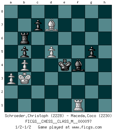 Last move : 1/2-1/2 2022 March 17 0:38:39 [Event "FICGS__CHESS__CLASS_M__000097"] [Site "FICGS"] [Date "2022.01.08"] [Round "1"] [White "Schroeder,Christoph"] [Black "Maceda,Coco"] [Result "1/2-1/2"] [WhiteElo "2228"] [BlackElo "2230"] 1.e4 e5 2.Nc3 Nf6 3.d4 exd4 4.Qxd4 Nc6 5.Qd3 Bc5 6.Bf4 d6 7.Qd2 Be6 8.O-O-O Bb4 9.Qd3 O-O 10.f3 a5 11.Kb1 Qe7 12.Nge2 d5 13.exd5 Bxd5 14.Nxd5 Nxd5 15.Qb5 Na7 16.Qc4 b5 17.Qe4 Qxe4 18.fxe4 Nxf4 19.Nxf4 Rfe8 20.g3 Rab8 21.Bg2 Bd6 22.Rd5 Nc6 23.Re1 g6 24.Nd3 f6 25.a3 h5 26.Bh3 Re7 27.Bf1 Ne5 28.Nxe5 Rxe5 29.c3 Kg7 30.b4 axb4 31.cxb4 Rxd5 32.exd5 h4 33.Re3 hxg3 34.hxg3 f5 35.Kc2 Kf6 36.Be2 Be5 37.g4 g5 38.Rh3 fxg4 39.Bxg4 Bf4 40.Bd7 Ke5 41.Kb3 Ke4 42.Rh1 Rb6 43.Rd1 Be3 44.Rf1 Bf4 1/2-1/2 Vienna : Falkbeer variation Queenside Castling by player White (move 8) Kingside Castling by player Black (move 9) This chess game ended in a draw. Follow this game move after move (download)What is the difference between chess and football? Everybody understands football, but nobody plays it. Everybody plays chess, but nobody understands it. Everything is relative. (Vladimir Kramnik) Wenn Capablanka heute auf der Schachbühne erscheinen würde, hätte er ein halbes Jahr gebraucht um sich die Schachtheorie anzueignen. Und dann hätte er alles und jeden besiegt. (Mikhail Moiseyevich Botvinik) No puedes jugar al Ajedrez si eres de corazón noble. (Proverbio Francés) On est toujours la mazette de quelqu'un d'autre. (Anonyme) Convictions are more dangerous enemies of truth than lies. (Friedrich Nietzsche)