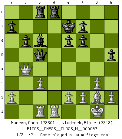 Last move : 1/2-1/2 2022 February 15 21:44:52 [Event "FICGS__CHESS__CLASS_M__000097"] [Site "FICGS"] [Date "2022.01.08"] [Round "1"] [White "Maceda,Coco"] [Black "Wiaderek,Piotr"] [Result "1/2-1/2"] [WhiteElo "2230"] [BlackElo "2212"] 1.d4 Nf6 2.c4 e6 3.Nf3 d5 4.Nc3 Bb4 5.Qb3 c5 6.dxc5 Nc6 7.Bg5 Qa5 8.Bxf6 dxc4 9.Qxc4 gxf6 10.Rc1 Qxc5 11.Qh4 Ke7 12.g3 Bxc3+ 13.bxc3 b6 14.Bg2 Bb7 15.O-O Rac8 16.Rfd1 h5 17.Ne1 Rhd8 18.Nd3 Qa5 19.Nb4 Qg5 20.Nxc6+ Bxc6 21.Qb4+ Qc5 1/2-1/2 Queen's pawn game Kingside Castling by player White (move 15) This chess game ended in a draw. Follow this game move after move (download)Chess holds its master in its own bonds, shackling the mind and brain so that the inner freedom of the very strongest must suffer. (Albert Einstein) Die unerbitterlichsten Regeln im Schach sind die Ausnahmen. (Savielly Grigorievitsch Tartakower) La maestría del Ajedrez consiste esencialmente en analizar posiciónes de Ajedrez con precisión. (Mikhail Botvinnik) Les pièces de l'échiquier étaient impitoyables. Elles le retenaient, elles l'absorbaient. Il y avait de l'horreur en cela, mais aussi une harmonie unique. Car, qu'y a-t-il dans le monde, à part les échecs ? (V. Nabokov) If everyone is thinking alike, then somebody isn't thinking. (US General George S. Patton)
