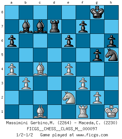 Last move : 1/2-1/2 2022 April 6 23:16:32 [Event "FICGS__CHESS__CLASS_M__000097"] [Site "FICGS"] [Date "2022.01.08"] [Round "1"] [White "Massimini Gerbino,Massimiliano"] [Black "Maceda,Coco"] [Result "1/2-1/2"] [WhiteElo "2264"] [BlackElo "2230"] 1.d4 Nf6 2.c4 e6 3.Nf3 d5 4.Nc3 c6 5.Bg5 h6 6.Bh4 dxc4 7.e4 g5 8.Bg3 b5 9.Be2 Bb7 10.O-O Nbd7 11.Ne5 Bg7 12.Nxd7 Nxd7 13.Bd6 a6 14.a4 b4 15.Bxb4 Qb6 16.Ba3 Qxd4 17.Qc2 c5 18.Rad1 Qe5 19.Bxc4 Qc7 20.Ne2 Be5 21.Kh1 O-O 22.b3 Nf6 23.Bd3 Rfd8 24.f3 Bxh2 25.Qxc5 Rd7 26.Qxc7 Bxc7 27.Bb2 Nh5 28.Bc4 Rad8 29.Rxd7 Rxd7 30.Bc1 1/2-1/2 Queen's pawn game Kingside Castling by player White (move 10) Kingside Castling by player Black (move 21) This chess game ended in a draw. Follow this game move after move (download)One doesn't have to play well, it's enough to play better than your opponent. (Siegbert Tarrasch) Mein erstes Ziel war nicht, die Partie zu gewinnen, sondern eine Figur zu opfern. -- der junge (Wilhelm Steinitz) El juego del Ajedrez no es solamente una diversión quieta; algunas cualidades muy valuables de la mente se pueden adquirir y cultivar con el, como convertirlos en habitos disponibles para toda ocasión; ya que la vida es algo así como el Ajedrez. (Benjamin Franklin) Votre seul travail dans les ouvertures est d'obtenir un milieu de partie jouable. (Lajos Portish) Humor is by far the most significant activity of the human brain. (Edward De Bono)