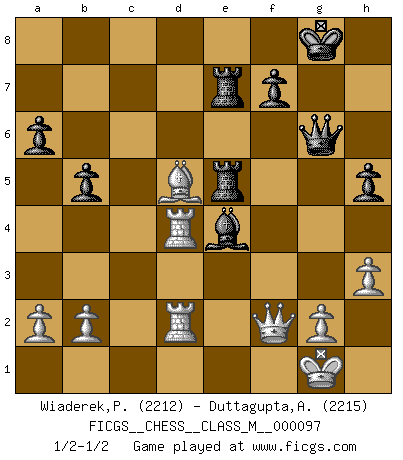 Last move : 1/2-1/2 2022 July 9 5:11:41 [Event "FICGS__CHESS__CLASS_M__000097"] [Site "FICGS"] [Date "2022.01.08"] [Round "1"] [White "Wiaderek,Piotr"] [Black "Duttagupta,Aniruddha"] [Result "1/2-1/2"] [WhiteElo "2212"] [BlackElo "2215"] 1.d4 Nf6 2.c4 e6 3.Nf3 d5 4.Nc3 Bb4 5.Qa4+ Nc6 6.e3 O-O 7.Bd2 dxc4 8.Bxc4 Bd6 9.Qc2 e5 10.dxe5 Nxe5 11.Nxe5 Bxe5 12.f4 Bxc3 13.Bxc3 Ng4 14.Bd4 c5 15.Bxc5 Re8 16.O-O Nxe3 17.Bxe3 Rxe3 18.Qf2 Re8 19.Rad1 Qc7 20.Bb5 Re7 21.Rc1 Qd8 22.Rfd1 Qf8 23.f5 Re5 24.Bd3 Bd7 25.f6 Bc6 26.fxg7 Qxg7 27.Bf1 a6 28.Rc4 Be4 29.Rcd4 h5 30.h3 Rae8 31.R1d2 R8e7 32.Bc4 b5 33.Bd5 Qg6 1/2-1/2 Queen's pawn game Kingside Castling by player Black (move 6) Kingside Castling by player White (move 16) This chess game ended in a draw. Follow this game move after move (download)Chess is a terrible game. If you have no center, your opponent has a freer position. If you do have a center, then you really have something to worry about ! (Siegbert Tarrasch) Die meiste Zeit treffe ich auf Gegner, die meine Enkel sein könnten. Ich bin da, um ihnen zu zeigen, dass sie von mir noch einiges lernen können. (Viktor Kortschnoi) El Ajedrez es una hermosa aventura. (Bent Larsen) D'abord les bases : Jouez et étudiez, puis étudiez et jouez, ensuite jouez et étudiez, puis étudiez et jouez. Deuxièmement : Donnez toujours le meilleur de vous-même ! (Ken Smith) Memory is a complicated thing, a relative to truth, but not its twin. (Barbara Kingsolver, Animal Dreams)