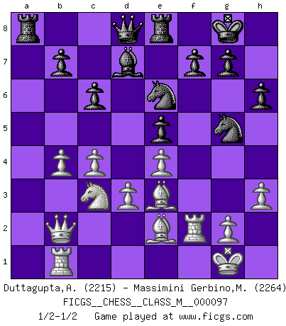 Last move : 1/2-1/2 2022 March 30 1:6:34 [Event "FICGS__CHESS__CLASS_M__000097"] [Site "FICGS"] [Date "2022.01.08"] [Round "1"] [White "Duttagupta,Aniruddha"] [Black "Massimini Gerbino,Massimiliano"] [Result "1/2-1/2"] [WhiteElo "2215"] [BlackElo "2264"] 1.c4 e5 2.Nc3 Nf6 3.Nf3 Nc6 4.e4 Bb4 5.d3 d6 6.a3 Bc5 7.b4 Bb6 8.Na4 Bd4 9.Nxd4 Nxd4 10.Be2 O-O 11.O-O Bd7 12.Nc3 c6 13.f4 a5 14.Rb1 axb4 15.axb4 Re8 16.Qd2 h6 17.h3 Ne6 18.fxe5 dxe5 19.Qb2 Nh7 20.Be3 Nhg5 21.Rf2 1/2-1/2 English Opening Kingside Castling by player Black (move 10) Kingside Castling by player White (move 11) This chess game ended in a draw. Follow this game move after move (download)Best by test: 1. e4 (Bobby Fischer) Was ist der Unterschied zwischen einem Strassenarbeiter und einem Schachspieler? --Der Schachspieler bewegt sich ab und zu. (Anonymous) Todo se encuentra en un estado de flujo y esto incluye al mundo del Ajedrez. (Mikhail Botvinnik) Un journaliste : 'Vous préférez avoir une dame de plus sur l'échiquier ou au lit ?' Boris Spassky : 'Ca dépend de la position.' If only people were all showed a certain minimum level of niceness; if only people didn't retract verbal draw offers (without draw box ticked) on ficgs; if only people didn't kill; if only people didn't run concentration / extermination camps, if only people didn't drop nuclear bombs on Hiroshima and Nagasaki, and so on - it would be a much more beautiful world. But sadly, things are not so... (Normajean Yates)