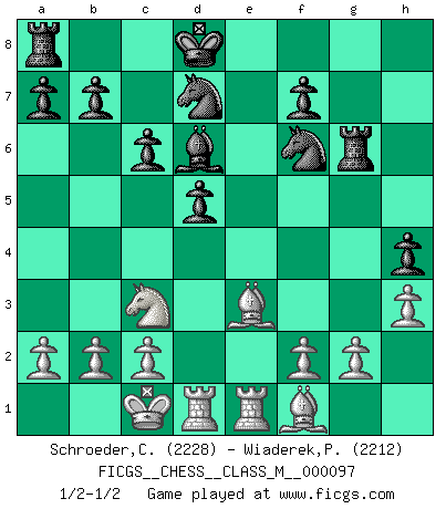 Last move : 1/2-1/2 2022 January 24 6:40:29 [Event "FICGS__CHESS__CLASS_M__000097"] [Site "FICGS"] [Date "2022.01.08"] [Round "1"] [White "Schroeder,Christoph"] [Black "Wiaderek,Piotr"] [Result "1/2-1/2"] [WhiteElo "2228"] [BlackElo "2212"] 1.e4 e5 2.Bc4 Nf6 3.d4 exd4 4.Nf3 Nxe4 5.Qxd4 Nf6 6.Nc3 Be7 7.Bg5 h6 8.Qh4 d5 9.O-O-O c6 10.Rhe1 Be6 11.Bd3 Kd7 12.Bd2 Bd6 13.Nd4 g5 14.Nxe6 gxh4 15.Nxd8 Kxd8 16.h3 Rg8 17.Bf1 Nbd7 18.Bxh6 Rg6 19.Be3 1/2-1/2 Bishop's Opening : Urusov gambit Queenside Castling by player White (move 9) This chess game ended in a draw. Follow this game move after move (download)The mistakes are there, waiting to be made. (Savielly Tartakower) Sitze auf Deine Hände. (Siegbert Tarrasch) La esencia del Ajedrez es pensar acerca de lo que el Ajedrez es. (David Bronstein) Toutes les manuvres exécutées sur une colonne ouverte ont pour but ultime l'intrusion définitive sur la septième ou la huitième rangée, en plein cur de la position ennemie. (Aaron Nimzovitch) You cannot beat a roulette table unless you steal money from it. (Albert Einstein)