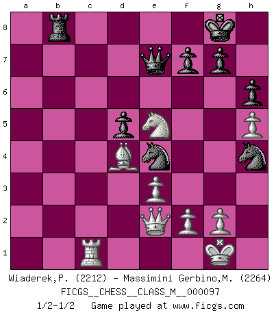 Last move : 1/2-1/2 2022 June 17 0:54:46 [Event "FICGS__CHESS__CLASS_M__000097"] [Site "FICGS"] [Date "2022.01.08"] [Round "1"] [White "Wiaderek,Piotr"] [Black "Massimini Gerbino,Massimiliano"] [Result "1/2-1/2"] [WhiteElo "2212"] [BlackElo "2264"] 1.d4 d5 2.c4 c6 3.Nf3 Nf6 4.e3 e6 5.b3 Nbd7 6.Bd3 Bd6 7.Bb2 O-O 8.O-O b6 9.Qe2 Bb7 10.Nbd2 Qe7 11.Rac1 h6 12.Rcd1 Ba3 13.Ba1 Rfe8 14.h3 Bb4 15.Bb2 c5 16.a3 Bxd2 17.Rxd2 dxc4 18.bxc4 Be4 19.Rc1 Red8 20.Bxe4 Nxe4 21.Rd3 Rac8 22.a4 Nf8 23.a5 Ng6 24.axb6 axb6 25.Rb3 Qc7 26.Qc2 Nd6 27.Qd3 Ne7 28.Qe2 Ng6 29.h4 Ne4 30.Ba1 Qe7 31.h5 Nh4 32.Rxb6 cxd4 33.Bxd4 Rd5 34.Rb8 Rxb8 35.cxd5 exd5 36.Ne5 1/2-1/2 QGD Slav : 4.e3 Kingside Castling by player Black (move 7) Kingside Castling by player White (move 8) This chess game ended in a draw. Follow this game move after move (download)Bobby Fischer is the greatest Chess genius of all time ! (Alexander Kotov) Ich hatte Zahnschmerzen im ersten Spiel. In der zweiten Partie tat mir der Kopf weh. In der dritten war es eine Rheuma-Attacke und während der vierten fühlte ich mich nicht gut. Und in der fünften? Nun, man muss doch nicht jedes Spiel gewinnen, oder? (Savielly Grigorievitsch Tartakower) Debes de llevar a tu oponente hacia un profundo y obscuro bosque donde 2+2=5, y el camino que conduce a la salida es suficientemente ancho para solamente uno. (Mikhail Tal) Le génie consiste à savoir transgresser les règles au moment opportun. (Teichmann) Waiting for chance ? Play in casinos. (FICGS proverb)