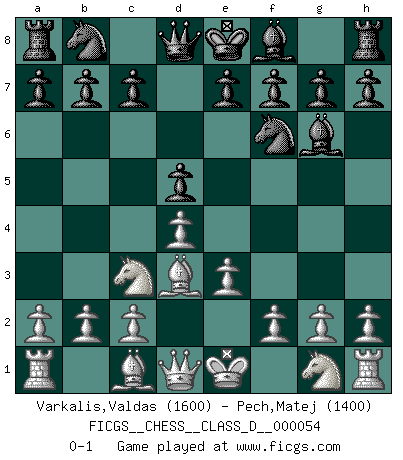 Last move : 0-1 2007 September 12 14:4:17 [Event "FICGS__CHESS__CLASS_D__000054"] [Site "FICGS"] [Date "2007.07.27"] [Round "1"] [White "Varkalis,Valdas"] [Black "Pech,Matej"] [Result "0-1"] [WhiteElo "1600"] [BlackElo "1400"] 1.d4 Nf6 2.e3 d5 3.Nc3 Bf5 4.Bd3 Bg6 0-1 This chess game has been lost on time (started : 2007.07.27 3:3:0) Queen's pawn game Player Black won this chess game. Follow this game move after move (download)In Fischer's hands, a slight theoretical advantage is as good a being a Queen ahead. (Isaac Kashdan) Kasparov stellt für gewöhnlich die Regeln auf und bricht sie dann selbst wieder. (Alexej Shirov) Hay jugadores fuertes y personas amables y yo soy un jugador fuerte. (Bobby Fischer) Il vaut toujours mieux jouer un plan faux de façon logique que de n'avoir pas de plan du tout. (Victor Kortchnoï) Without deviation from the norm, progress is not possible. (Frank Zappa)