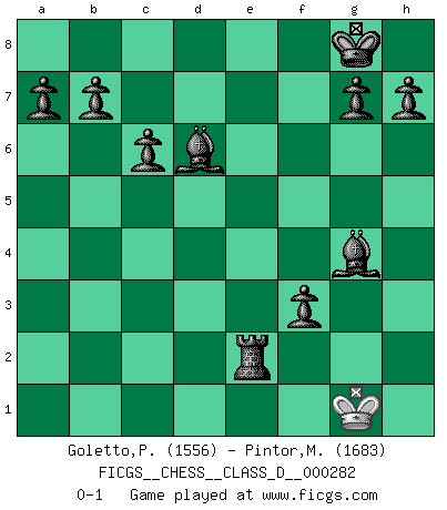 Last move : 0-1 2022 May 27 14:53:17 [Event "FICGS__CHESS__CLASS_D__000282"] [Site "FICGS"] [Date "2022.01.09"] [Round "1"] [White "Goletto,Piero Giuseppe"] [Black "Pintor,Manuel"] [Result "0-1"] [WhiteElo "1556"] [BlackElo "1683"] 1.e4 e5 2.Nf3 Nc6 3.Bb5 Qf6 4.O-O Bc5 5.Nc3 Nge7 6.d4 Nxd4 7.Nxd4 Bxd4 8.Ne2 Bb6 9.Ng3 O-O 10.Nh5 Qg6 11.Be3 c6 12.Ba4 Qxe4 13.f3 Qxa4 14.b3 Qa6 15.Re1 Ng6 16.c4 Bc7 17.Rc1 Qxa2 18.Rc2 Qxb3 19.Rc1 Qxd1 20.Rcxd1 d6 21.Ng3 f5 22.Nh5 f4 23.Bf2 Rf5 24.g4 fxg3 25.hxg3 Rxf3 26.Re3 Bg4 27.c5 Rxe3 28.Bxe3 Bxd1 29.Kf1 Bxh5 30.g4 Bxg4 31.cxd6 Bxd6 32.Bg5 Nf4 33.Bxf4 exf4 34.Ke1 Re8+ 35.Kf1 Re2 36.Kg1 f3 0-1 Ruy Lopez (Spanish Opening) Kingside Castling by player White (move 4) Kingside Castling by player Black (move 9) Player Black won this chess game. Follow this game move after move (download)If I win a tournament, I win it by myself. I do the playing. Nobody helps me. (Bobby Fischer) Wie ich sie so einen nach dem anderen nieder mähte wurde meine Überlegenheit offensichtlich. (José Raúl Capablanca) Un mal plan es mejor que no tener ningún plan. (Frank Marshall) Le joueur d'Echecs qui veut atteindre le top est obligé de développer son propre credo créatif. Alexeï Stepanovicth Souétine. Il est facile d'écrire des livres ! Ce qui est difficile, c'est de jouer ! (Alexeï Stepanovicth Souétine) Follow your passion, and success will follow you. (Arthur Buddhold)