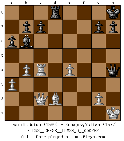 Last move : 0-1 2022 May 13 18:5:35 [Event "FICGS__CHESS__CLASS_D__000282"] [Site "FICGS"] [Date "2022.01.09"] [Round "1"] [White "Tedoldi,Guido"] [Black "Kehayov,Yulian"] [Result "0-1"] [WhiteElo "1580"] [BlackElo "1577"] 1.c4 e5 2.Nc3 Nc6 3.Nf3 Nf6 4.d3 Bc5 5.e3 O-O 6.a3 d5 7.cxd5 Nxd5 8.Be2 Be6 9.h3 Bb6 10.O-O a6 11.Bd2 f5 12.Rc1 Qf6 13.e4 Nxc3 14.Bxc3 Rac8 15.b4 fxe4 16.dxe4 Rfd8 17.Qc2 Kh8 18.Qb2 Nd4 19.Nxd4 exd4 20.Bd2 Qg6 21.Kh1 Bxh3 22.Bf3 Bg4 23.Qb3 d3 24.Bxg4 Qxg4 25.Rc4 Rf8 26.Qxd3 Rcd8 27.Qc2 Rxf2 28.Rxf2 Qh4+ 29.Kg1 Qxf2+ 30.Kh1 Qh4+ 0-1 English : Four knights, Capablanca variation Kingside Castling by player Black (move 5) Kingside Castling by player White (move 10) Player Black won this chess game. Follow this game move after move (download)I'm not afraid of Spassky. The world knows I'm the best. You don't need a match to prove it. (Bobby Fischer) Fischer: 'Remis!?' Uhlmann: 'Aber es muss doch dreimal Zugwiederholung sein!' Fischer: 'Sie nehmen das Remis an, wie ich es sage, sonst spiele ich weiter und werde Sie dann schlagen!' (Robert James Fischer) Bobby Fischer es el mas grande genio de Ajedrez de todos los tiempos. (Alexander Kotov) On est toujours la mazette de quelqu'un d'autre. (Anonyme) Now be brave and don't look back. Don't look back. (Shmi Skywalker in Star Wars ep.1)
