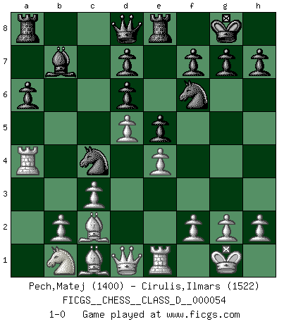 Last move : 1-0 2007 October 31 22:5:0 [Event "FICGS__CHESS__CLASS_D__000054"] [Site "FICGS"] [Date "2007.07.27"] [Round "1"] [White "Pech,Matej"] [Black "Cirulis,Ilmars"] [Result "1-0"] [WhiteElo "1400"] [BlackElo "1522"] 1.e4 e5 2.Nf3 Nc6 3.Bb5 a6 4.Ba4 Nf6 5.O-O b5 6.Bb3 Bd6 7.Re1 Bb7 8.d4 O-O 9.c3 Qe7 10.Nh4 Qd8 11.Nf5 Re8 12.Nxd6 cxd6 13.d5 Na5 14.Bc2 Nc4 15.a4 bxa4 16.Rxa4 1-0 Ruy Lopez : 5.O-O Kingside Castling by player White (move 5) Kingside Castling by player Black (move 8) Player White won this chess game. Follow this game move after move (download)It is difficult to play against Einstein's theory --on his first loss to Fischer. (Mikhail Tal) Ich verstehe den Grund nicht, warum die Aufteilung in Frauen und Männer überhaupt im Schach besteht. (Judith Polgar) A través de las casillas del tablero, los Indios explican el movimiento del tiempo y la edad, las influencias mas altas que controlan el mundo y los lazos que vinculan al Ajedrez con el alma humana. (Al-Masudi) Les Echecs, c'est l'art de la guerre sans les charniers, c'est la résurrection des morts tombés au champ d'honneur, l'espoir perpétuel, la suprématie de l'intelligence sur la force, la culture de l'esprit. (F. Szpiner) Bobby never cared about money, though. His only desire was to prove that his choices were correct: He wanted chess to be important because he was a chess player, and he wanted to be important. Bobby knew money was important, but he didn't have a clue why, outside of clothes and status. The only way he could accomplish what he wanted was to fight for a lot of money. Once he got it, he gave it away. He did not know how to spend it. And once he'd become champion, after, essentially, sacrificing his life for it, he didn't know how to spend his time. (Bob Wade)
